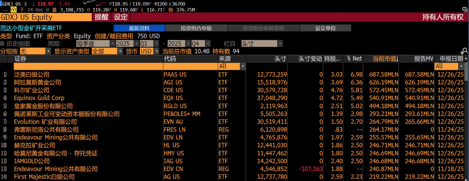 涨幅第三的ETF是 $小型黄金矿业ETF(Market Vectors)(GDXJ)$ ,年内涨幅超184%。第一大持仓股是 $泛美白银(PAAS)$ 、第二大持股是 $Alamos Gold Inc(AGI)$ (阿拉莫斯黄金)、第三大持股是 $科尔黛伦矿业(CDE)$ ,持仓聚焦金矿股: