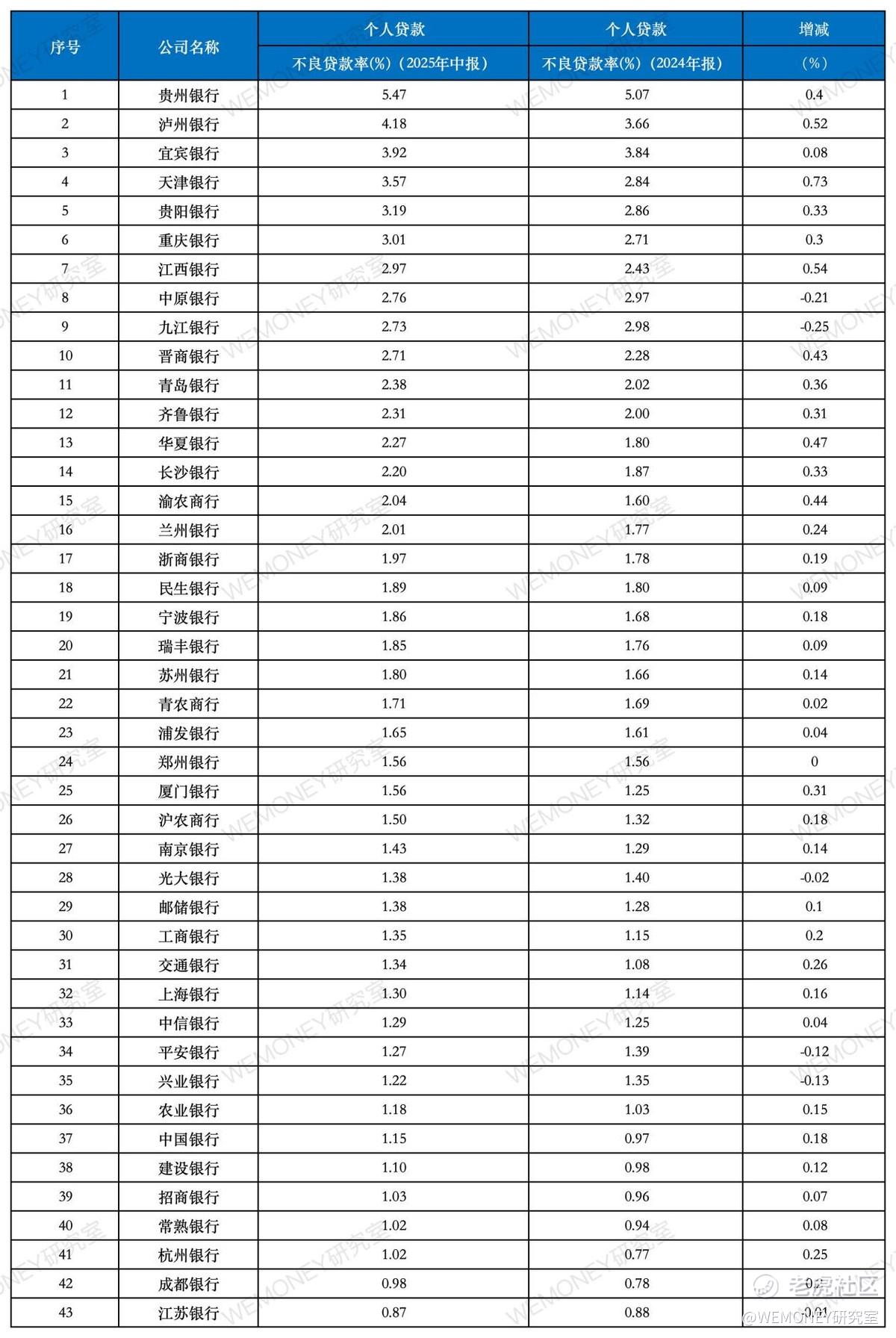 最近,盘了一下43家上市银行的个贷不良率。