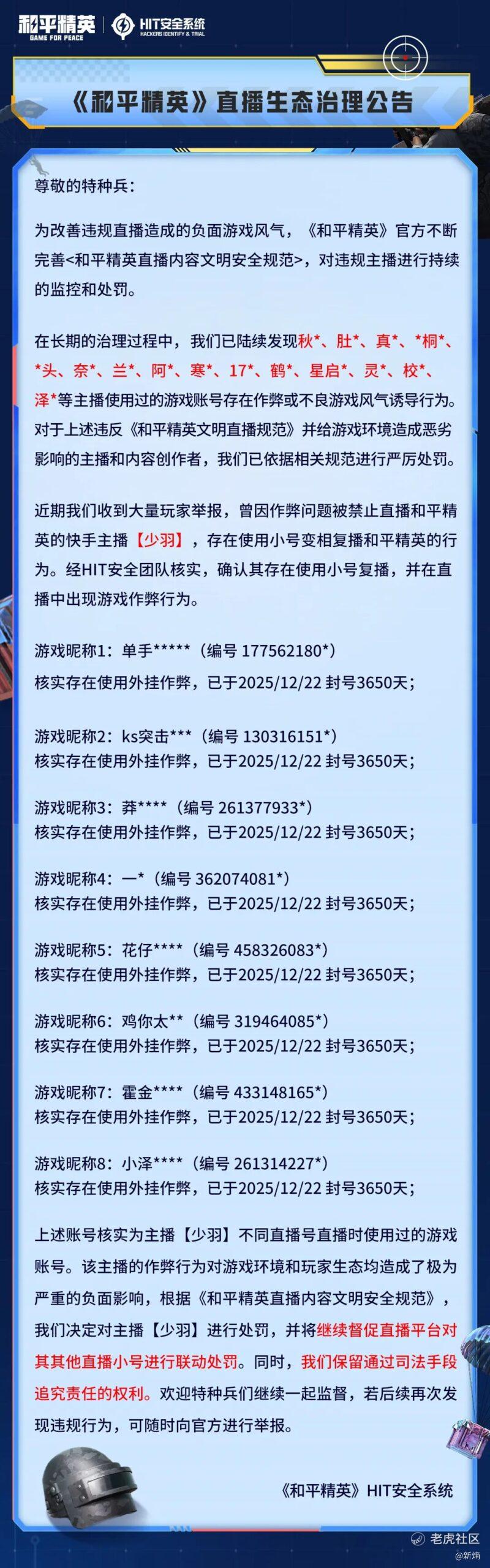 值得关注的是,在此次行动中,《和平精英》也在推动直播平台对“少羽”使用的多个直播小号实施联动封禁。这标志着治理模式从游戏内的单一处罚,升级为跨平台的生态联防。《和平精英》此次出手,正是向全行业宣告:治理已进入“零容忍+全链条”的新阶段。