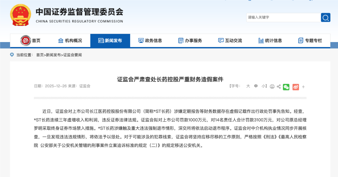 近日,证监会对上市公司长江医药控股股份有限公司(简称*ST长药)涉嫌定期报告等财务数据存在虚假记载作出行政处罚事先告知。经查,*ST长药连续三年虚增收入和利润,违反证券法律法规。证监会拟对上市公司罚款1000万元,对14名责任人合计罚款3100万元,对公司原总经理罗明采取终身证券市场禁入措施。*ST长药涉嫌触及重大违法强制退市情形,深交所将依法启动退市程序。证监会对中介机构执业情况同步开展核查,一旦发现违法违规情形,将依法予以惩处。对于可能涉及的犯罪线索,证监会将坚持应移尽移的工作原则,严格按照《刑法》《最高人民检察院 公安部关于公安机关管辖的刑事案件立案追诉标准的规定(二)》的规定移送公安机关。