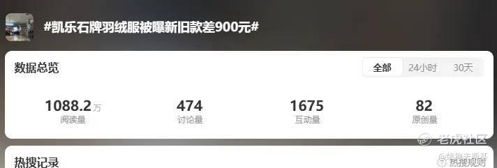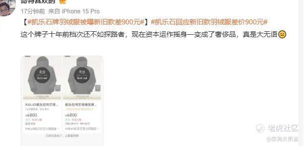 就好比今日,又有一个关于羽绒服的话题冲上热搜——凯乐石牌羽绒服被曝新旧款价差900元。