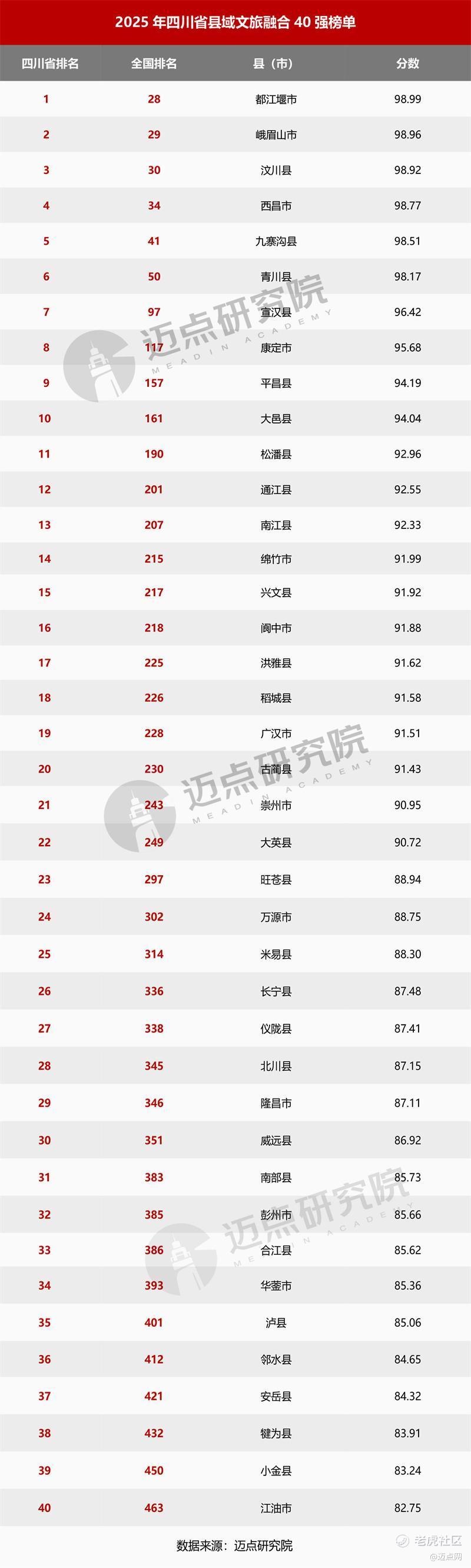 近期,迈点研究院发布了“2025年全国县域文旅融合100强榜单”,四川省有7个县域入榜,分别为都江堰市、峨眉山市、汶川县、西昌市、九寨沟县、青川县、宣汉县。从“2025年四川省县域文旅融合40强榜单”来看,40强县市均跻身全国县域文旅融合发展指数(CTDI)前500名,整体竞争力突出、发展韧性强劲,凭借“三遗资源富集、民族文化多元、生态基底优良”的独特优势,在全国县域文旅融合格局中稳稳占据“第一梯队”,成为西南地区县域文旅高质量融合的标杆阵营。