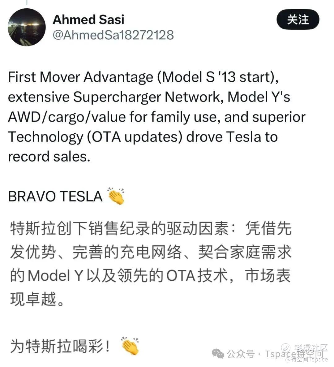 对于特斯拉在美国市场的持续热销,网友@Ahmed Sasi 分析指出,这得益于其在电动车领域长期积累的技术优势、日臻完善的超充网络服务,以及行业领先的OTA远程软件升级能力。此外,Model Y在安全、空间、性能以及智能等方面展现出的硬核产品力,与家庭用车需求高度契合,成为消费者心目中的首选车型。