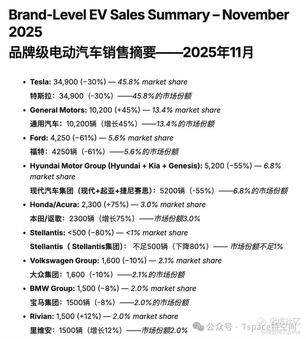 统计数据显示,11月美国纯电动车总销量约7.6万辆,其中特斯拉累计销量超3.4万辆,市占率45.8%位居第一。这意味着,在11月当地每卖出两辆纯电动车,就有一辆是特斯拉。