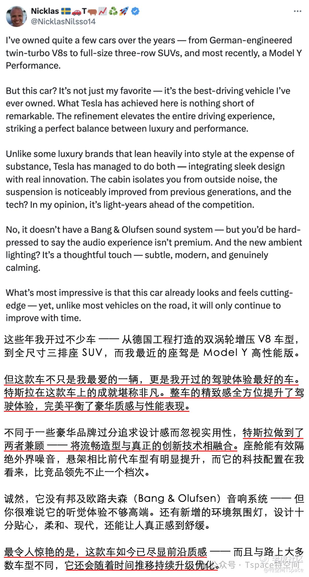 曾体验过多款豪华车型的海外博主@NicklasNilsso14 表示,Model Y是他心中“驾驶体验最好的车”,既实现了高性能与豪华质感的完美平衡,又兼顾了美学设计与实用性,车辆还能通过持续的OTA远程软件升级不断进化,让车常用常新。
