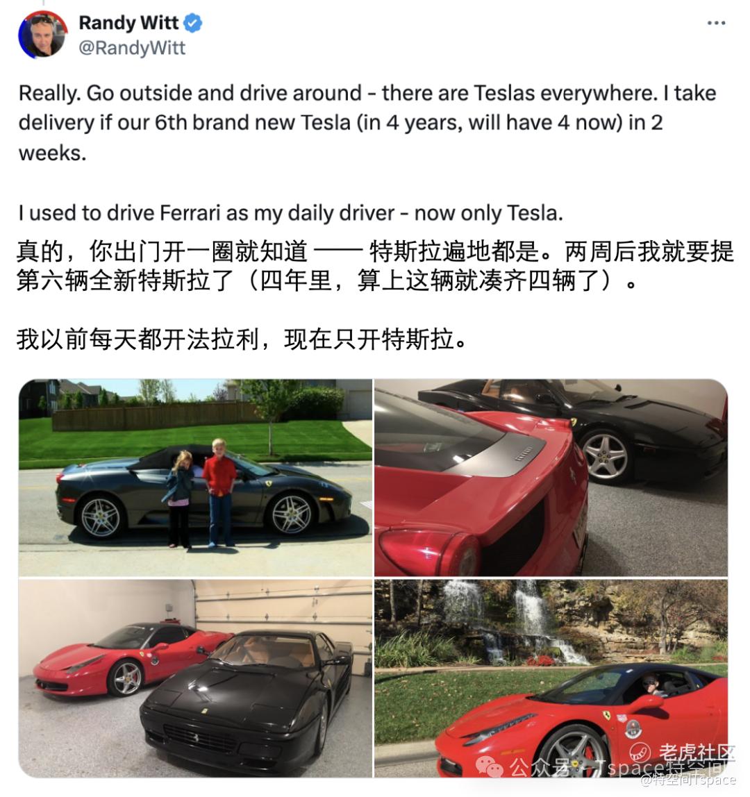 美国车主@RandyWitt 在四年内已先后购入4辆特斯拉,并且即将再提新车:“我以前每天开法拉利,现在只开特斯拉。”