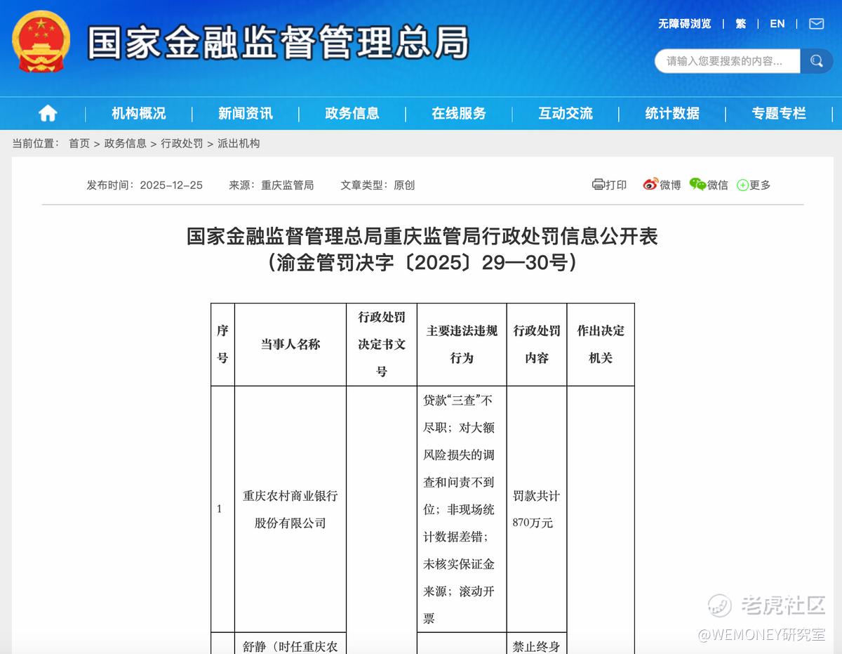 12月25日,国家金融监督管理总局重庆监管局行政处罚信息公开表显示,重庆农村商业银行(渝农商行),因贷款“三查”不尽职;对大额风险损失的调查和问责不到位;非现场统计数据差错;未核实保证金来源;滚动开票等,被罚款870万元。