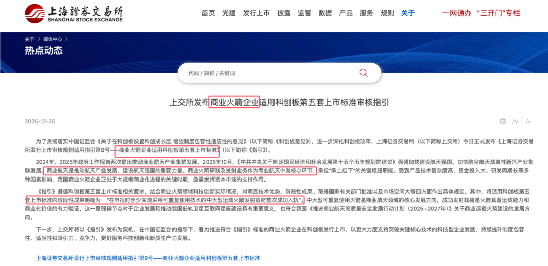 上交所更是在年底之前发布文件助推中国火箭,上交所发布的商业火箭企业适用科创板第五套上市标准审核指引表示,2024年、2025年政府工作报告两次提出推动商业航天产业集群发展。2025年10月,《中共中央关于制定国民经济和社会发展第十五个五年规划的建议》强调加快建设航天强国,加快航空航天战略性新兴产业集群发展。《指引》遵循科创板第五套上市标准相关要求,结合商业火箭领域科技创新实际情况,对明显技术优势、阶段性成果、取得国家有关部门批准以及市场空间大等四方面作出具体规定。其中,将适用科创板第五套上市标准的阶段性成果明确为:“在申报时至少实现采用可重复使用技术的中大型运载火箭发射载荷首次成功入轨”。中大型可重复使用火箭是商业航天领域的核心发展方向,成功发射载荷是火箭具备运载能力和商业化价值的有力验证,这一里程碑节点对于企业发展和推动我国低轨卫星互联网星座建设具有重要意义,也符合我国《推进商业航天高质量安全发展行动计划(2025—2027年)》关于商业运载火箭建设的发展方向。
