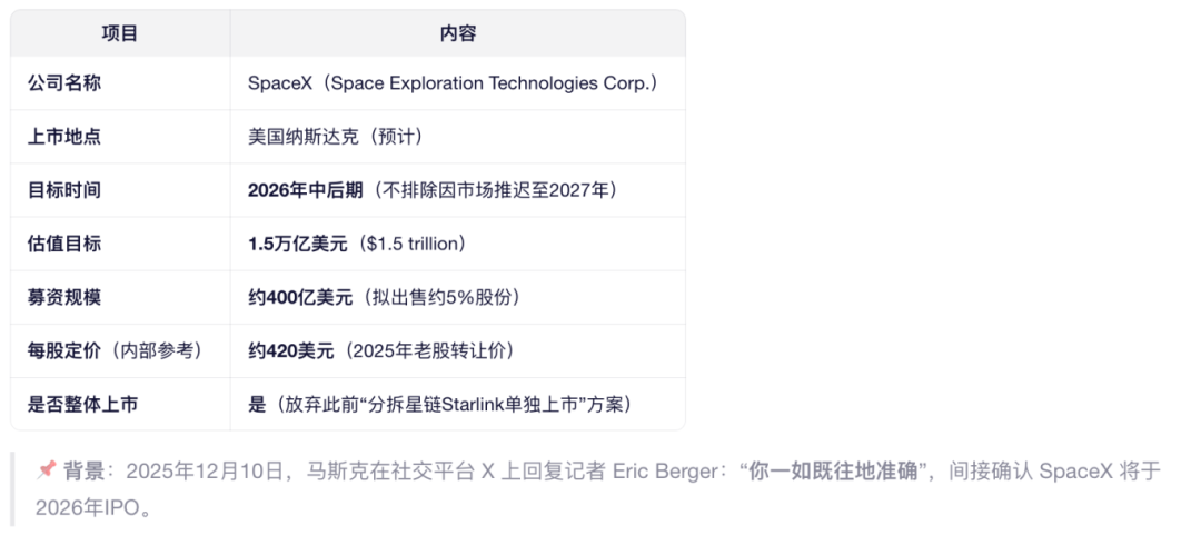 2025年底,埃隆·马斯克正式确认旗下太空探索技术公司(SpaceX)将于2026年启动IPO,目标估值高达1.5万亿美元,有望成为人类历史上规模最大的首次公开募股。