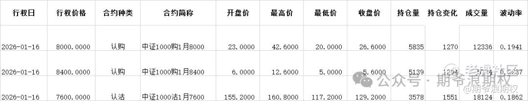 (4)中证1000期权:1月最大持仓范围7200-7600,今收7605.53,上涨0.35%,3连阳。期权1月主力合约,认购和认沽都是低行权价减仓高行权价增仓。认购减仓集中在7000-7500,合计2500张;增仓集中在7600-8400,合计6800张;认沽减仓集中在6500-6900,合计1000张,增仓集中在7500-7800,合计2800张。变化超过1000张的如下,都是增仓,而且行权价都偏高。