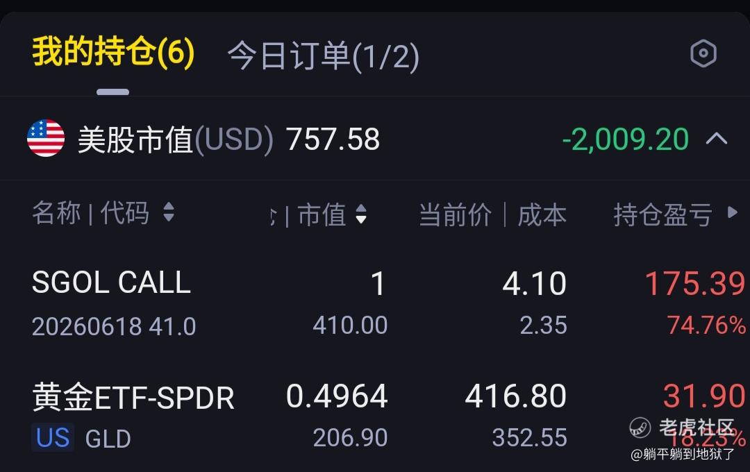二、当前持仓及本周操作:本周没有操作。1、SPDR黄金ETF(GLD):0.50005股。2、长期看涨期权1手(SGOL--CALL--20260618--41元):成本价格2.35元。