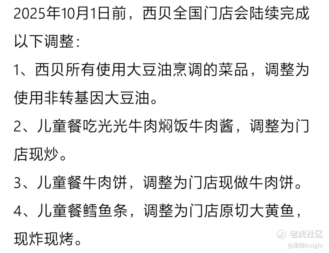 根据西贝公布的9项整改措施,大豆油被更换为非转基因油,儿童餐牛肉焖饭、羊肉串、羊排、肉夹馍等核心菜品改为门店现制。