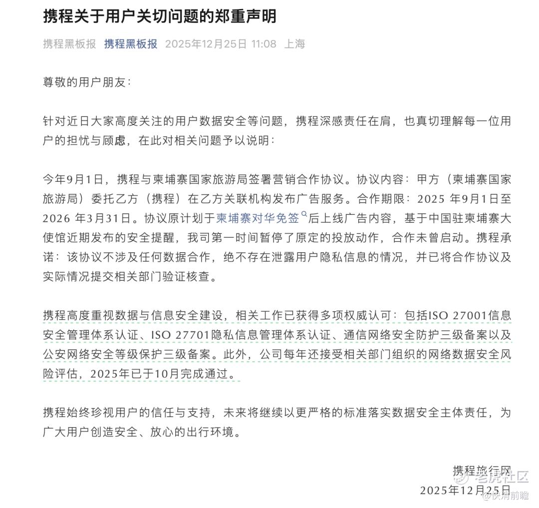 更关键的是,携程在声明中反复强调该协议“不涉及任何数据合作,绝不存在泄露用户隐私信息的情况”。携程方面承诺,用户的身份证号、行程、联系方式等数据并未也绝不会因这次广告合作而共享给柬埔寨方面。为打消公众疑虑,携程表示已将合作协议文本及实际情况提交相关主管部门进行核实验证。