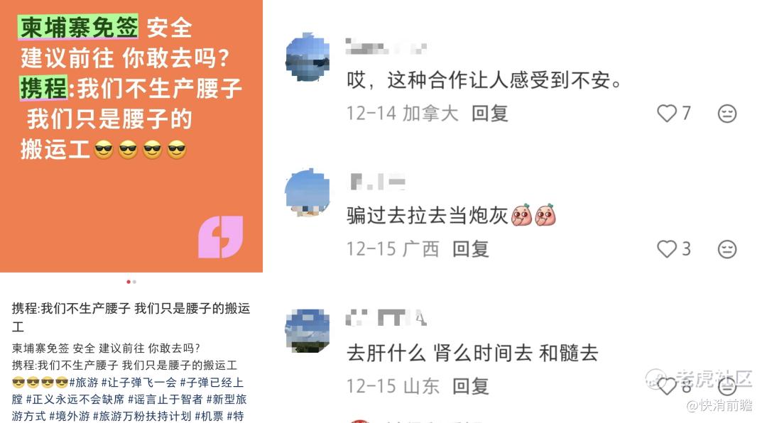 不少网友表示“这种合作让人感受到不安”;甚至有网友半开玩笑地表示:“骗过去拉去当炮灰?”;更有甚者质疑:“要是在柬埔寨被绑架,携程能救我吗?”──这些极端言论背后,是用户对潜在人身风险的真实焦虑。