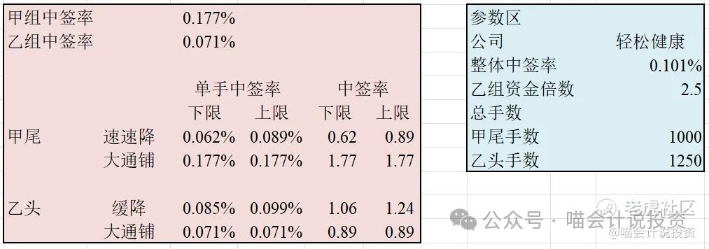 乙组申购资金为甲组的1.983倍,甲组单手中签率0.1049%,乙组单手中签率0.0529%;【喵老师事前预测:甲组0.177%,乙组0.071%,是因为培训后大量资金涌入轻松健康,导致中签率下降。】