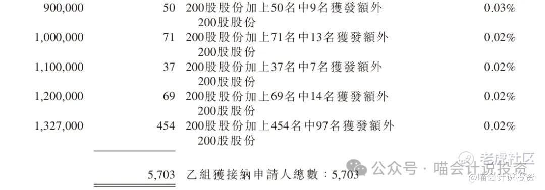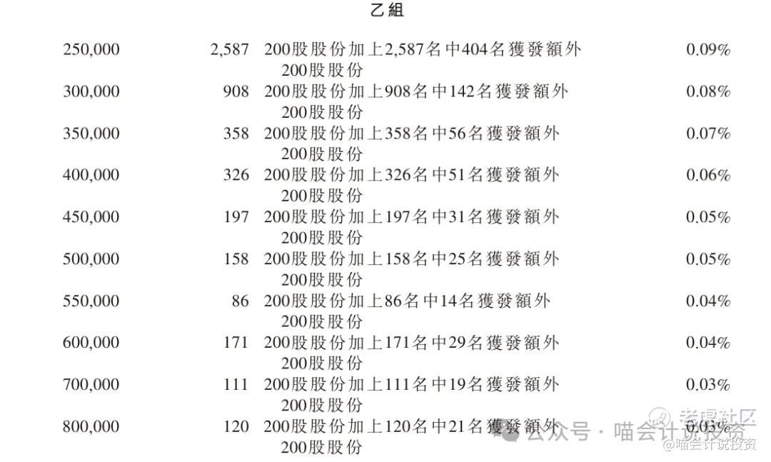 乙组分配:狂降,乙头单手中签率0.0925%(为乙组均值的1.75倍),1250手中签1.15手;顶头槌6635手中签1.21手(认购量是乙头的5.3倍,获配手数相仿)。【因为是狂降,喵老师事前预测作废。实质上是5703万人均分6635手。】