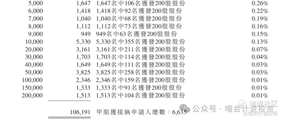 甲组分配:狂降,甲尾单手中签率0.0069%(为甲组均值的7%),1000手中签率仅为6.87%;一手摸中签率6.00%(1000倍认购,中签率相仿);【因为是狂降,喵老师事前预测作废。实质上是10.6万人均分6635手。】