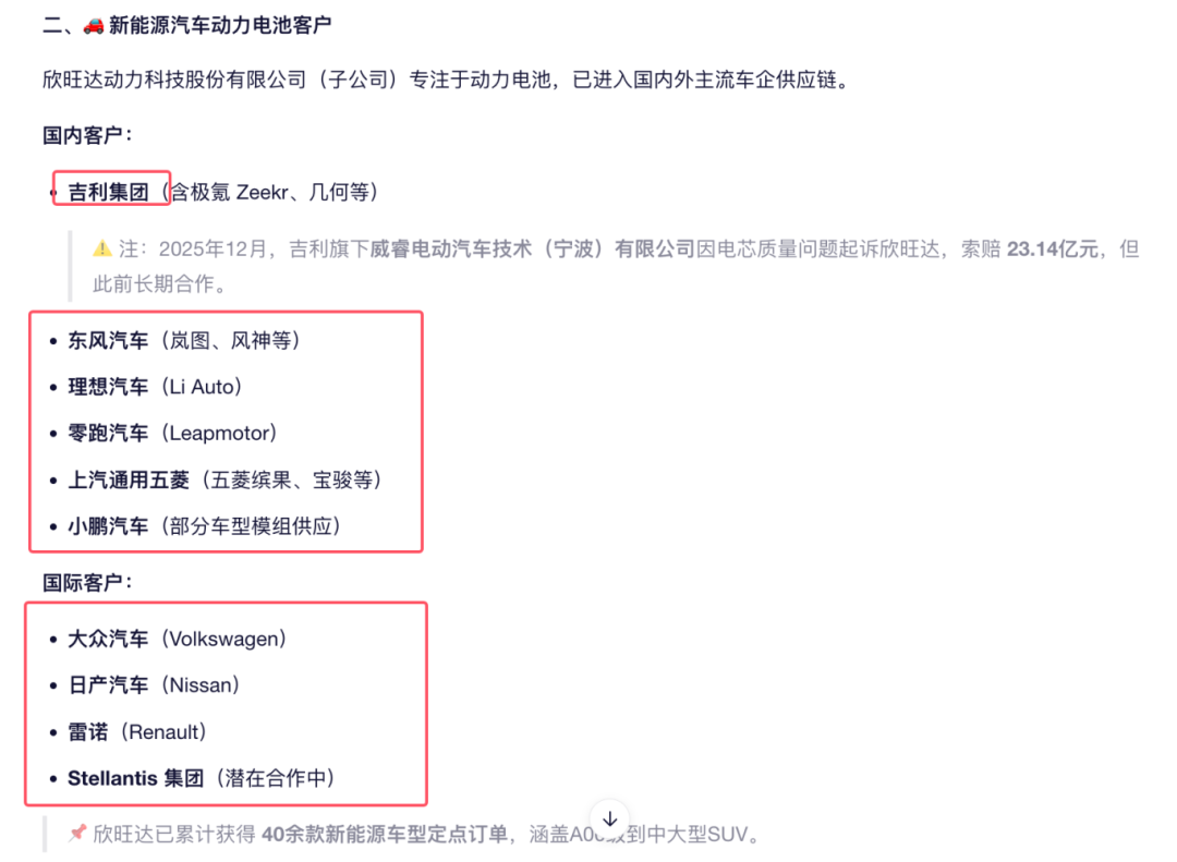 2 、欣旺达2025 年 7 月申请港股 IPO,看了一下说明书,公司在介绍重要客户的时候已经没有吉利,表述是这样的:我们已成为领先的汽车OEM的重要动力类电池商,包栝理想、小鹏、零跑、广汽、上汽、雷诺及日产等。现在爆出这样的重大诉讼,对于港股 IPO 的节奏可能被打乱。
