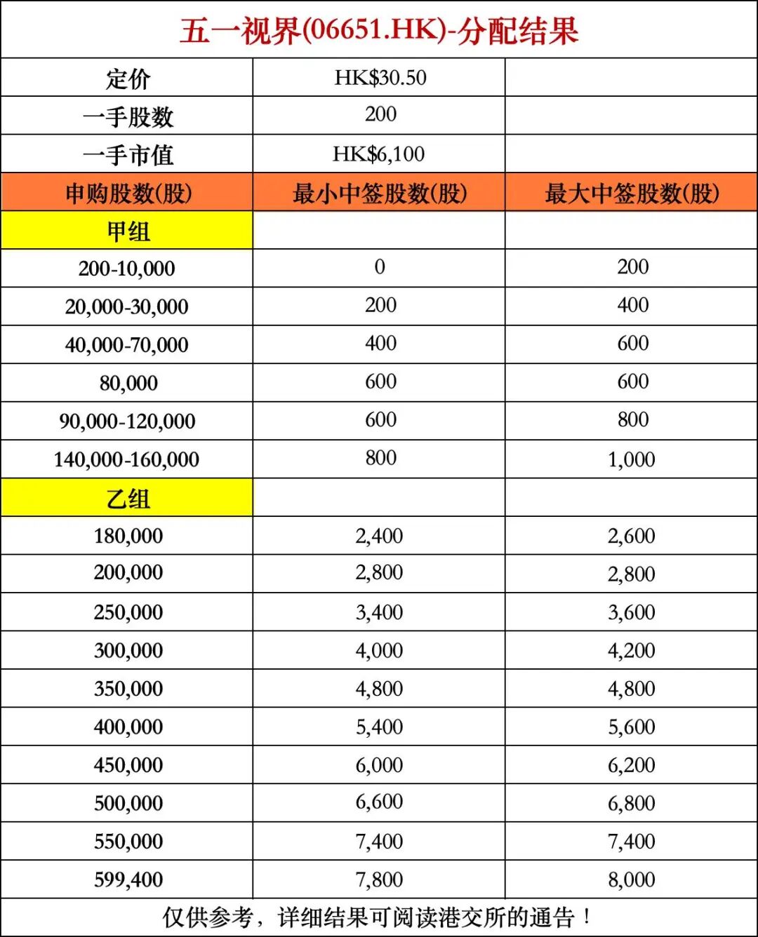 五一视界招股一口定价30.5港元,一手市值6100港元。有4.4万人认购,超购258倍,认购100手稳中一手,乙头中签12手,货值7.3万港元。中签率比预计的高很多,大部分资金都去认购确定性更高的林清轩和英硅智能了。