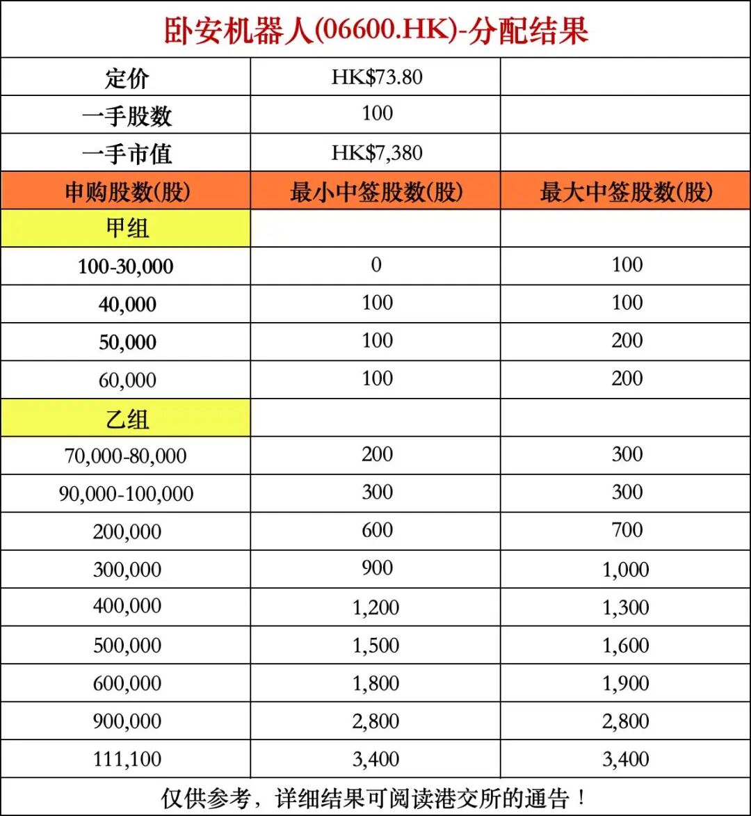 卧安机器人以招股价63~81港元的中间定价73.8港元,一手市值7380港元。认购400手稳中一手,乙组头中签2~3手。招股期间孖展曾出现“抽飞”,就是已经认购的资金撤销认购,导致中签率比预计的要高。