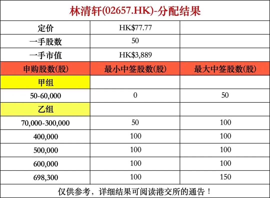 林清轩招股一口定价77.77港元,一手市值3889港元。甲组全部抽签,乙头稳中一手,这个分配偏向乙头,因为顶头槌的股数是乙头的10倍,最多也才中签3手。