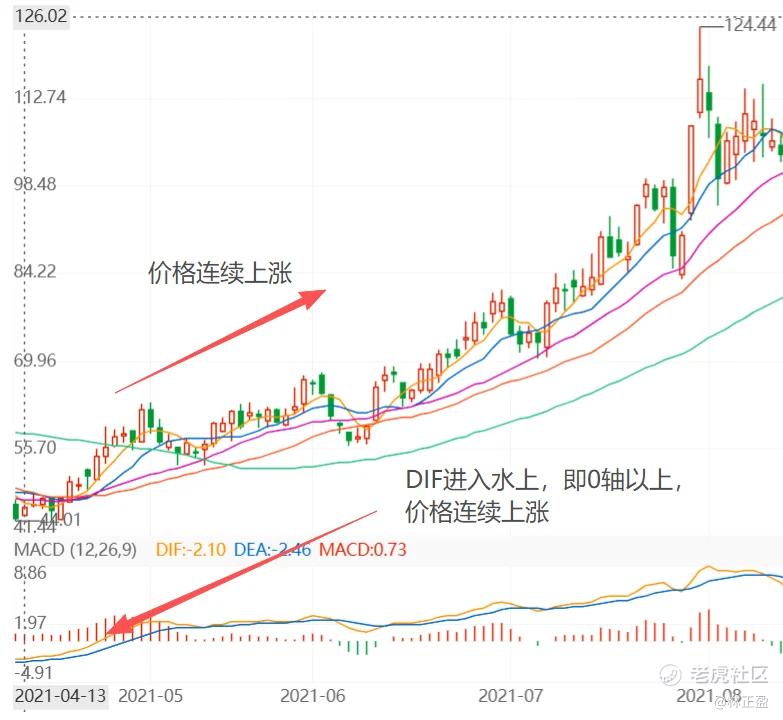 二、MACD的基本用法:零轴为多空分界线,DIF在零轴上方则为多头市场,下方是空头市场,零轴附近震荡则多空平衡。