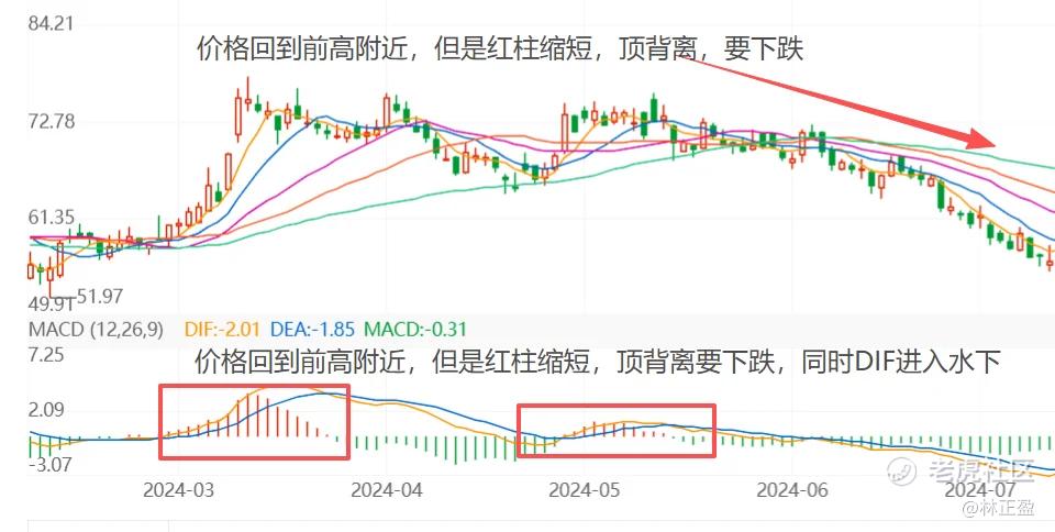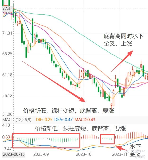 四、MACD的高级技巧: 背离是指价格走势与MACD走势出现方向不一致的现象,预示着趋势可能反转。 当股价创新高,但是DIF线未创新高(或柱状图高度降低),上涨动能衰竭,可能见顶。