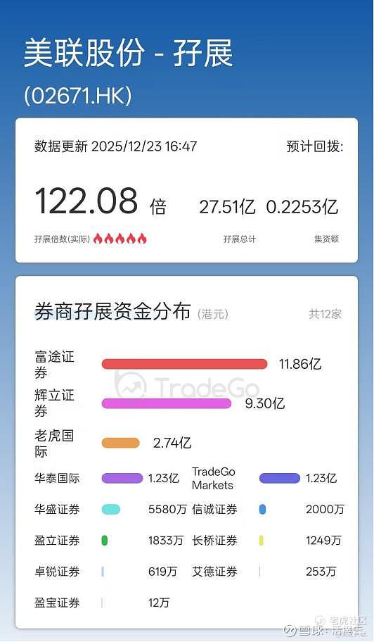 据捷利交易宝新股数据显示,近期完成招股的美联股份(2671.HK)即将于12月29日下午开启暗盘,12月30日正式挂牌上市,截至招股截止日,其孖展认购金额约27.51亿港元,孖展倍数约122.08倍,整体认购情绪还不错;其中富途证券、辉立证券、老虎国际、华泰国际及TradeGo Markets分别放出11.86亿、9.3亿、2.74亿、1.23亿及1.23亿港元的孖展。