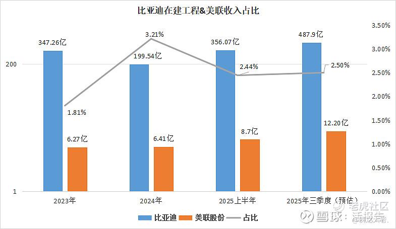 另外,根据比亚迪三季报财报显示,其在建工程约487.90亿人民币,同比上一年增长176.59%,环比半年报则新增131.83亿人民币;美联股份作为比亚迪的御用的预制钢结构建筑商,可预见其2025年来自于比亚迪的全年收入将随之水涨船高。