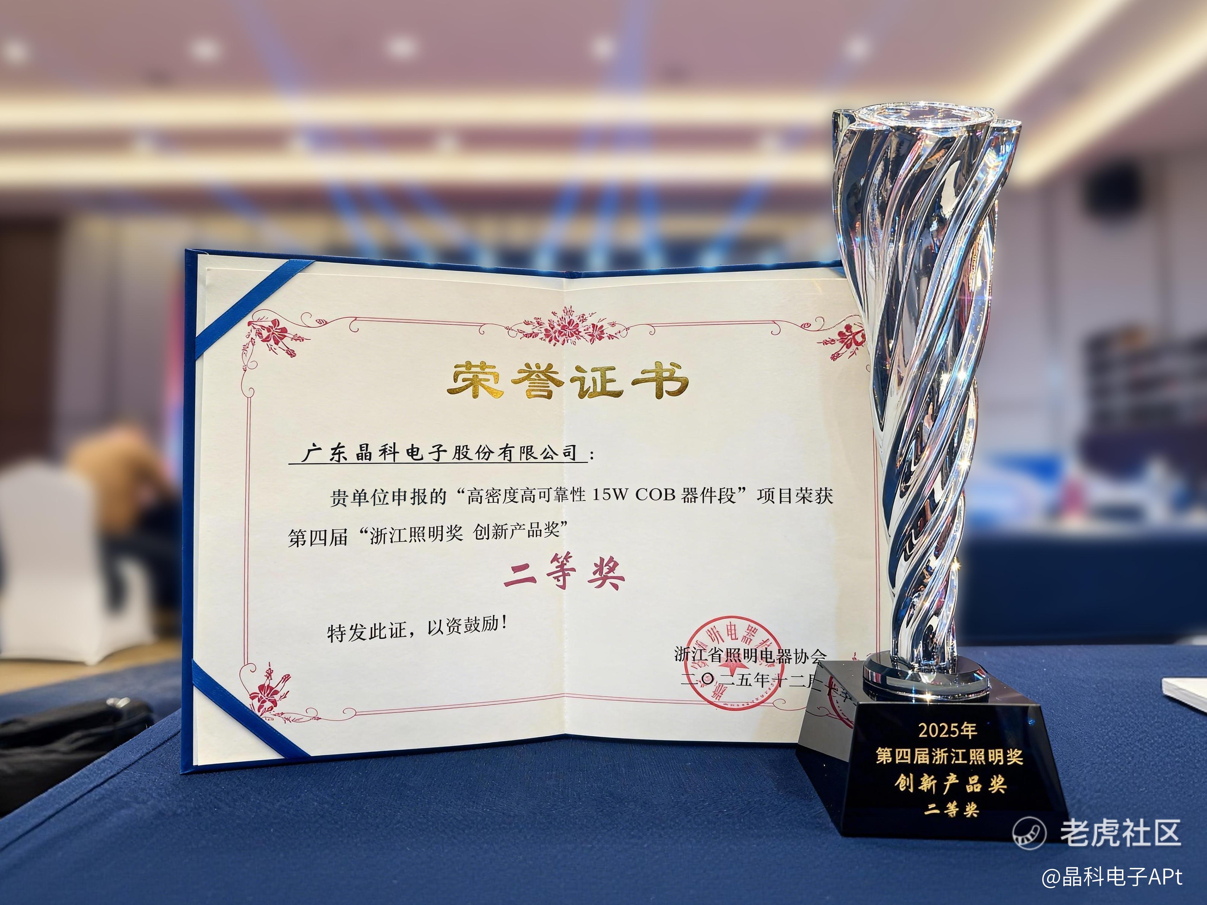 在商业照明领域,核心光源器件的性能边界直接决定了终端灯具的品质上限。广东晶科电子股份有限公司(简称:晶科电子,股票代码:2551.HK)自主研发的高密度高可靠性 15W COB 器件,近日荣获2025第四届浙江照明奖“创新产品奖”二等奖。这不仅是行业对晶科电子产品的认可,更是对晶科电子以「LED+」技术构建智能视觉与感知的底层光电半导体平台赋能高端照明创新的肯定。