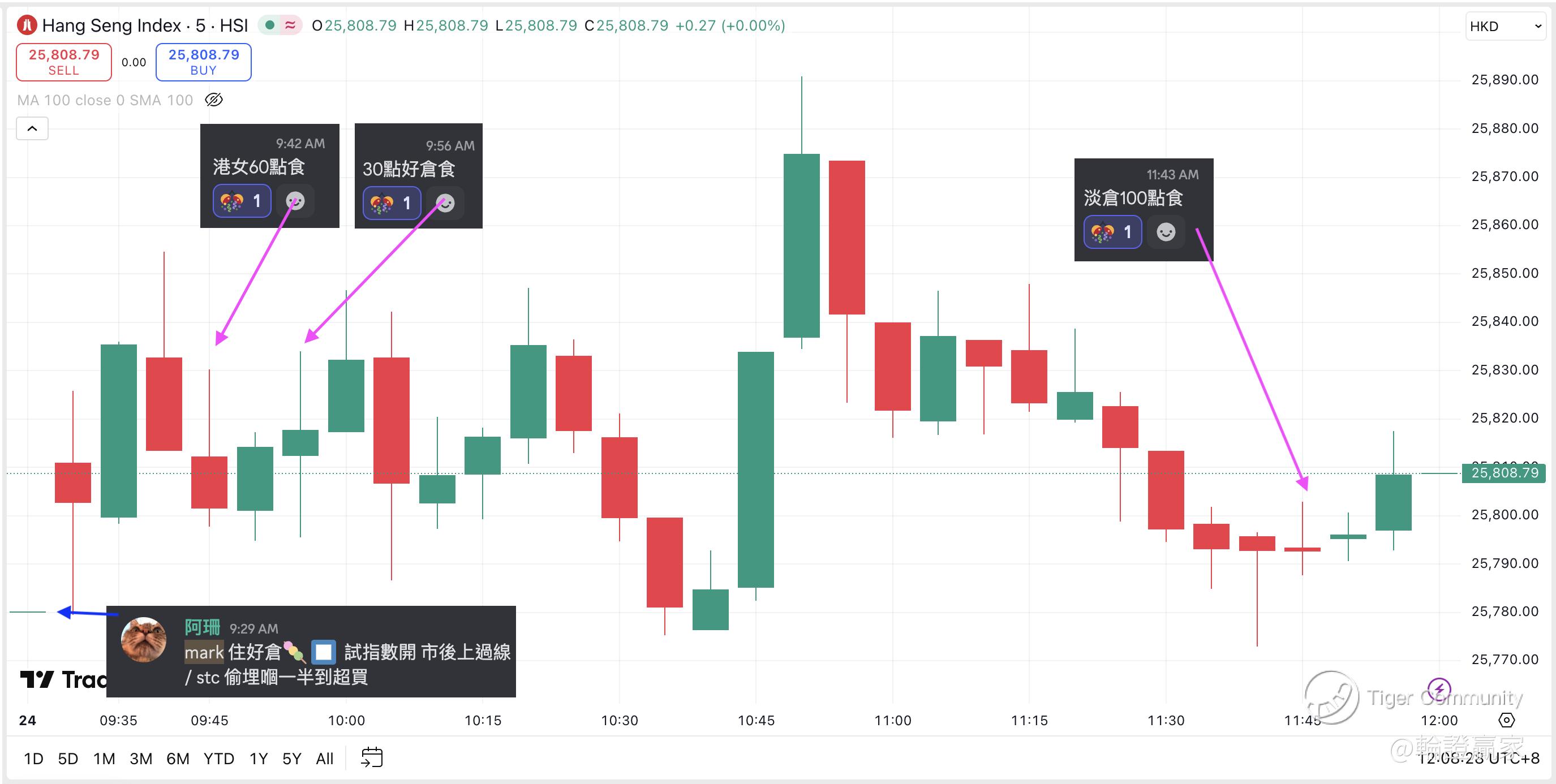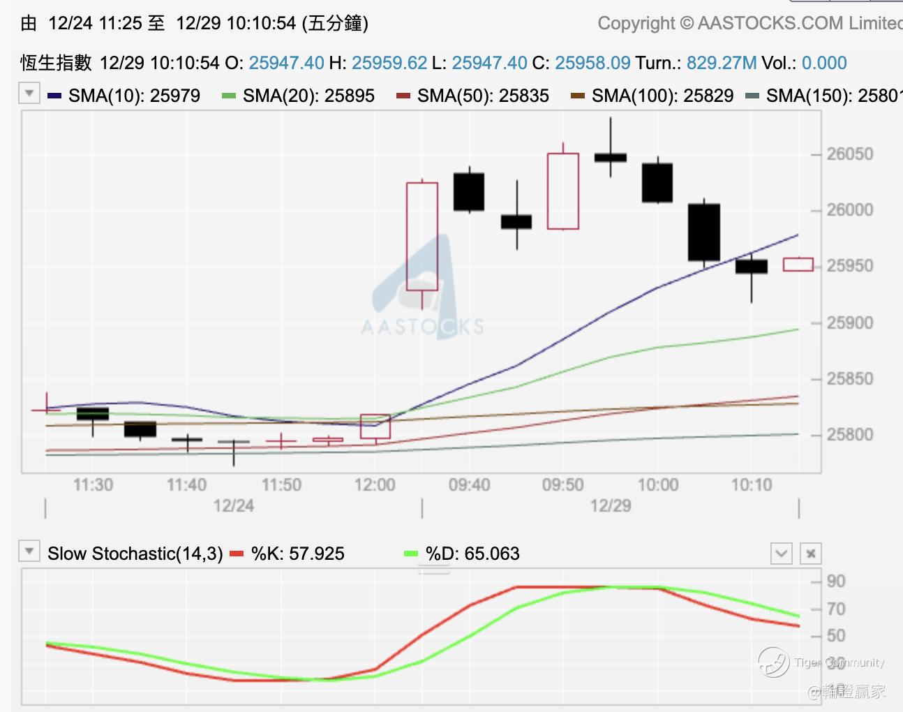 依家10点11分,五分钟图上见 $HSI(HSI)$ 向下落到10线以下位置,Slow STC(14.3)两线亦都有见触顶向下回返落去中轴水平,作战室借紧10线做上方量度线守住淡仓,爬格仔mode嘅就追博五分钟图嘅Slow STC(14.3)落返去超卖位。