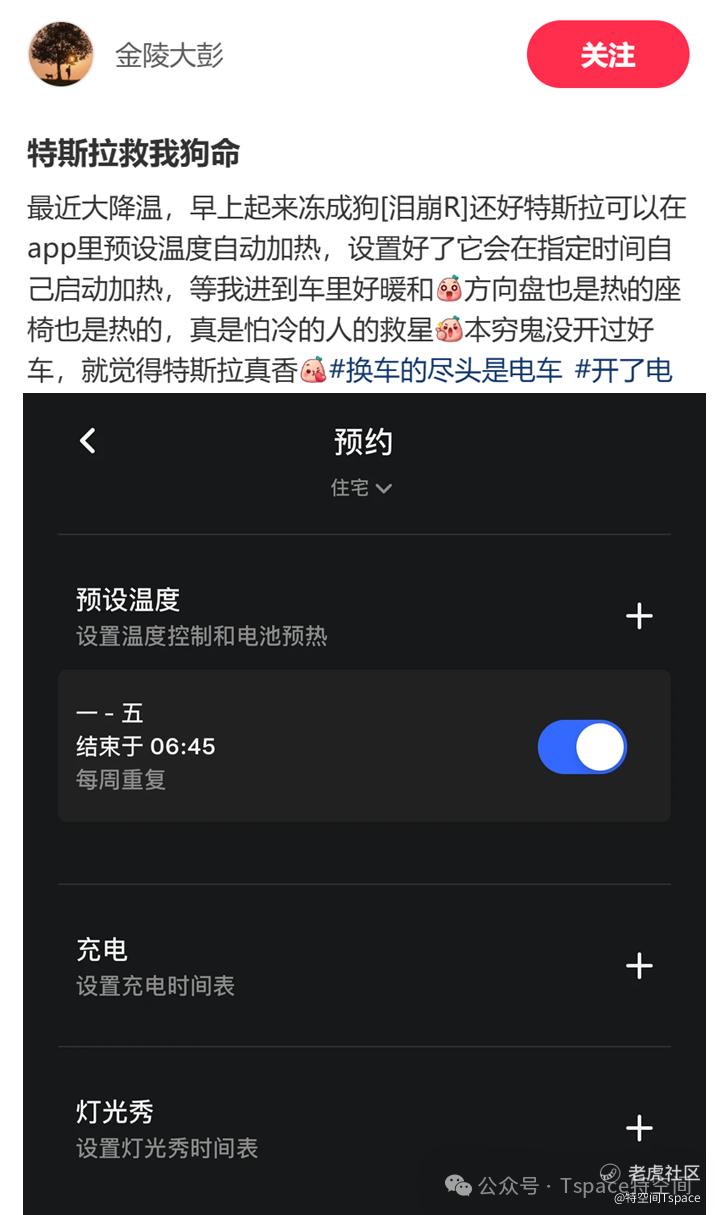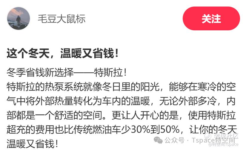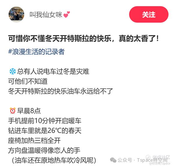 “油车还在原地热车吹冷风,特斯拉提前几分钟暖车,进车感受的是全身的温暖,真香!”