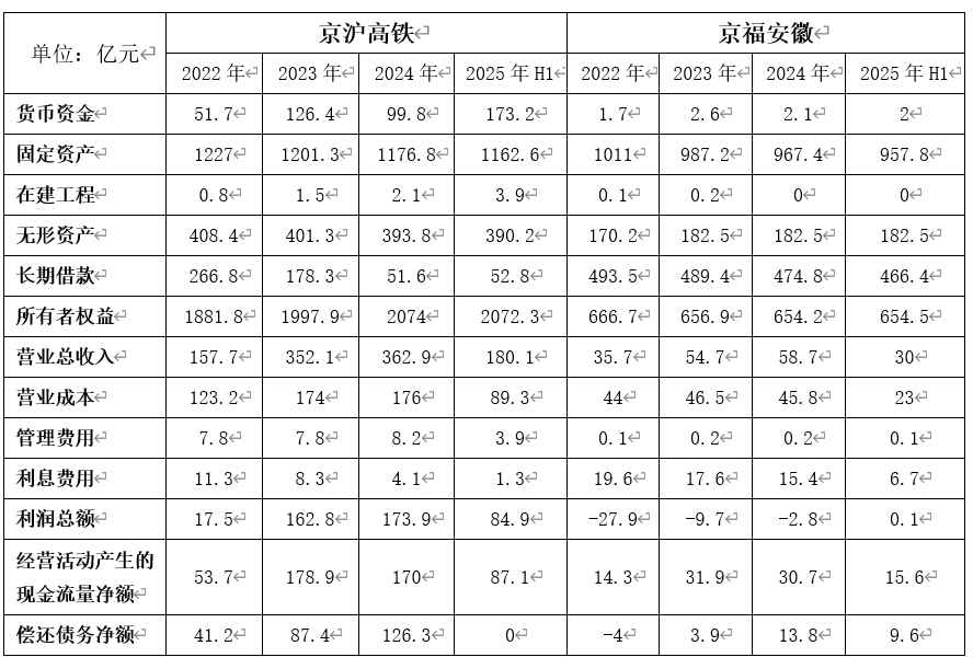2022-2025年H1京沪高铁、京福安徽主要财务数据