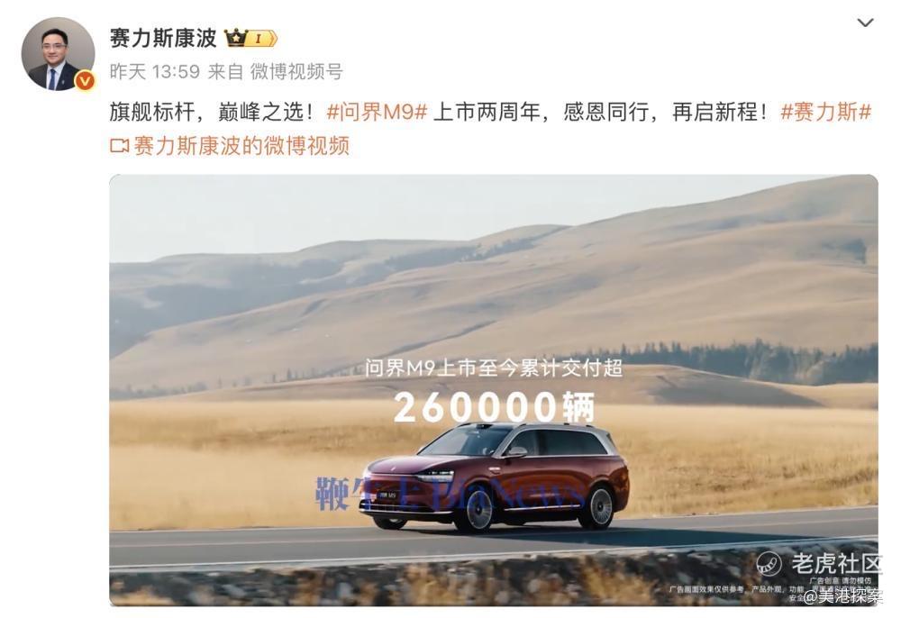 12月27日,赛力斯集团副总裁康波昨日发布鸿蒙智行问界M9上市两周年的宣传视频,视频中提到问界M9上市至今累计交付超26万辆。