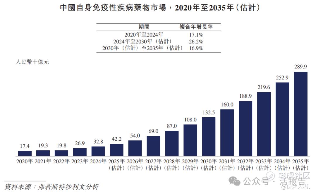 根据弗若斯特沙利文(Frost & Sullivan)的资料,2020年至2024年,中国自身免疫性疾病药物市场规模从人民币174亿元增至人民币328亿元,复合年增长率为17.1%,预计将于2030年及2035年分别达到人民币1,325亿元及人民币2,899亿元,2024年至2030年的复合年增长率为26.2%,2030年至2035年的复合年增长率为16.9%。