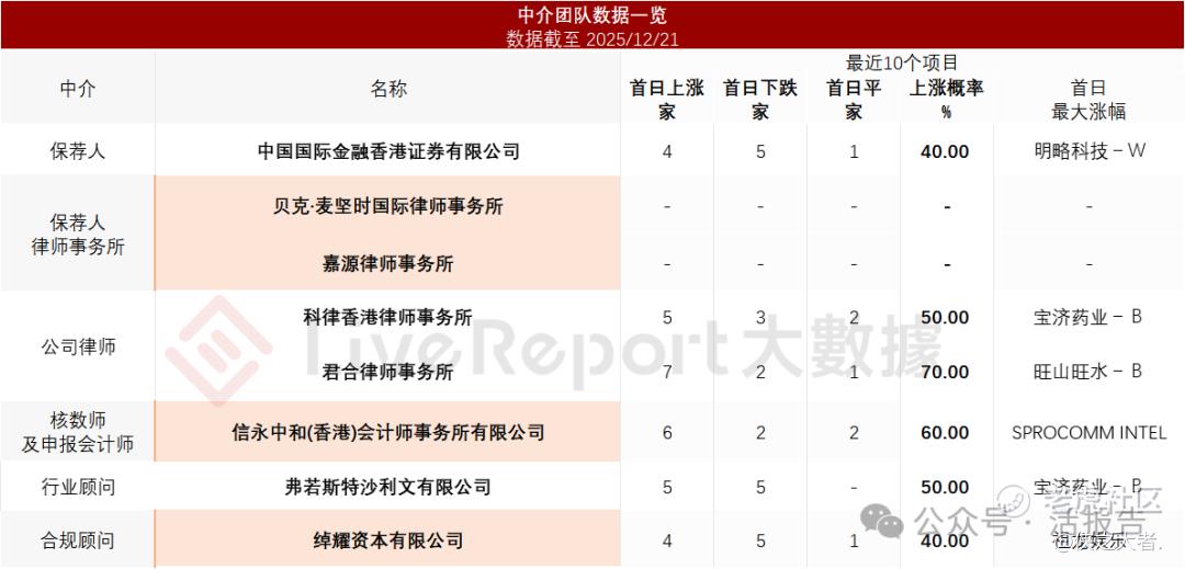 据**大数据统计,泽璟制药中介团队共计8家,其中保荐人1家,近10家保荐项目数据表现不理想;公司律师共计2家,综合项目数据表现有待加强。整体而言中介团队历史数据表现有待提升。
