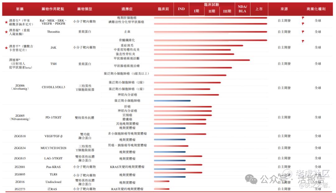 公司的产品组合及管线涵盖已上市药物、后期临床候选药物及处于创新前沿的早期发现项目。截至最后实际可行日期,公司拥有三款已上市药物:泽普生®(甲苯磺酸多纳非尼片),为中国首款本土研发用于晚期肝癌一线治疗的小分子多靶点药物;泽普平®(盐酸吉卡昔替尼片),为中国首款本土研发用于治疗骨髓纤维化的创新型JAK抑制剂;以及泽普凝®(重组人凝血酶),为中国唯一采用重组DNA技术研发并成功商业化的重组人凝血酶。整体而言,已上市药物为公司带来了强劲且可持续的现金流。
