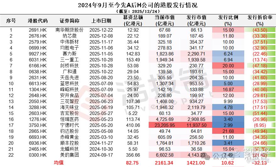截至2025年12月24日,2024年9月份至今成功赴港上市的A股公司合计22家,平均发行折价率约为32.13%。