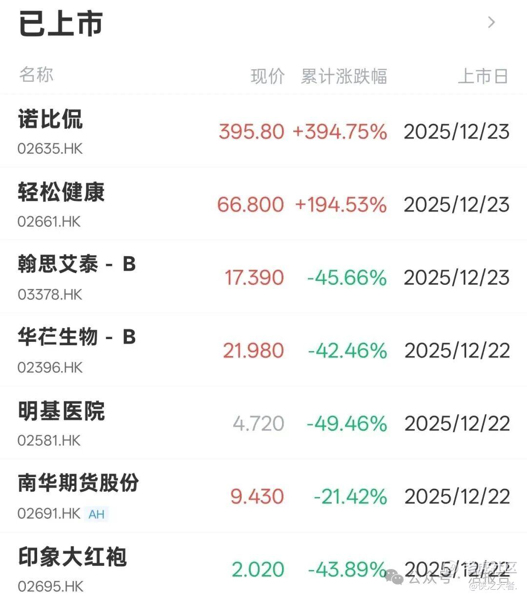 最近一周,诺比侃、轻松健康、翰思艾泰-B、华芢生物-B、明基医院、南华期货(AH)、印象大红成功上市,其中诺比侃、轻松健康首日分别大涨363.75%、158.82%,其余五只新股均出现破发,新股显现加速分化之势。