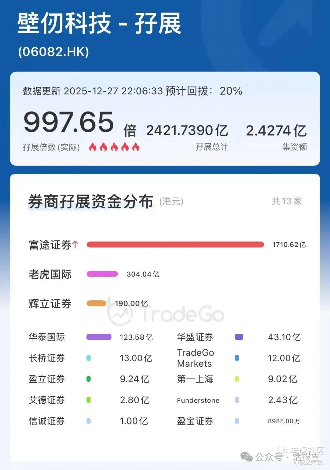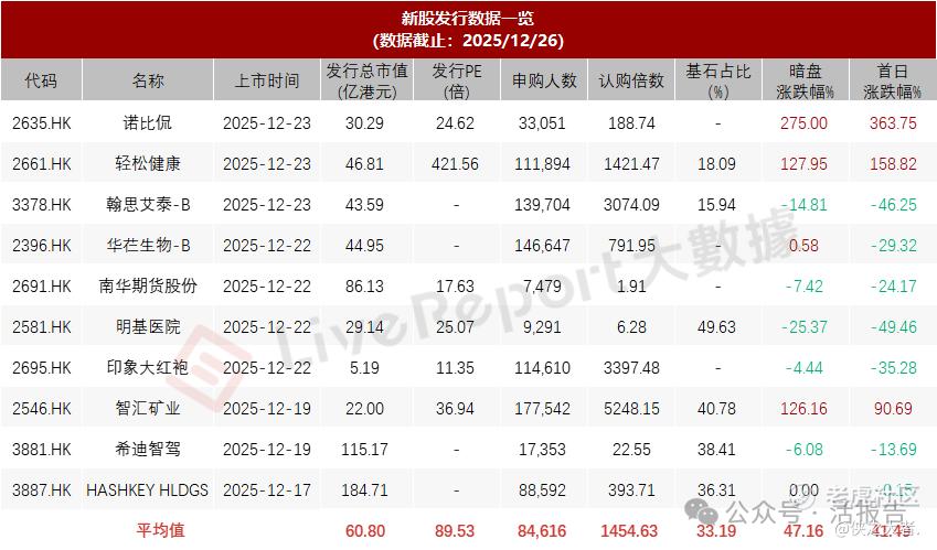 最近一周,林清轩、美联股份、迅策、英矽智能、卧安机器人、五一视界已完成招股,即将于本年末一齐登场;壁仞科技正在招股,预计于2026年1月2日挂牌上市。据TradeGo新股孖展数据,截至12月27日22时,壁仞科技孖展总额已达2422亿港元,孖展认购倍数达998倍。