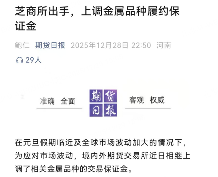 年末快到了,市场依旧延续上周的情况,成交也相对清淡。而清淡的时候往往一个短期消息会令市场出现较大的波动,大家需要稍微注意一下(尤其是追高的朋友)。周末,芝商所(CME Group)于12月26日发布重大保证金调整通知称,将于12月29日(周一收盘后)全面上调黄金、白银、铂金、钯金等金属期货品种的履约保证金。