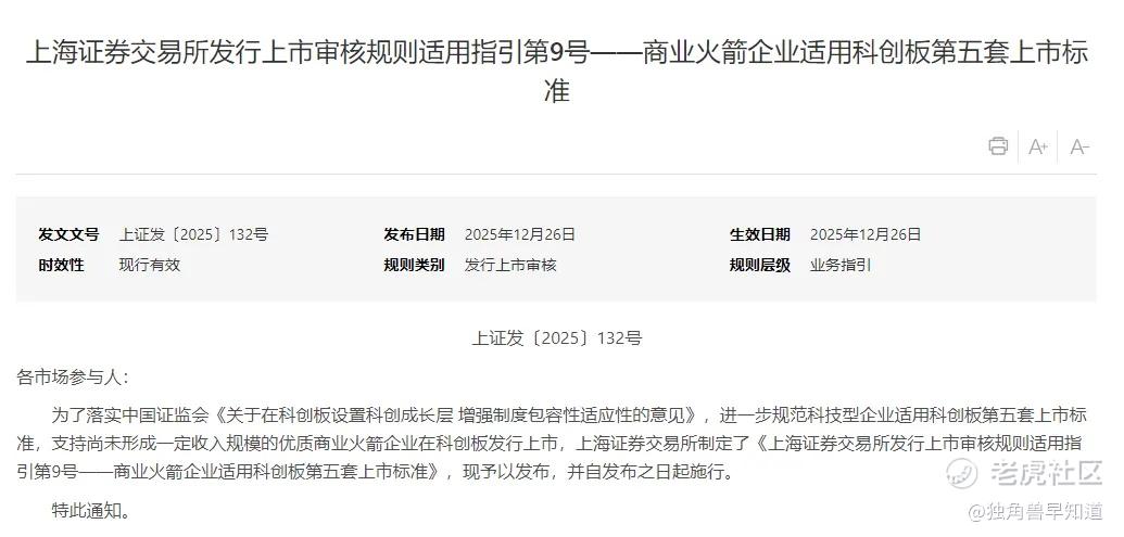 12月26日,上海证券交易所制定的《上海证券交易所发行上市审核规则适用指引第9号——商业火箭企业适用科创板第五套上市标准》发布,并自发布之日起施行。