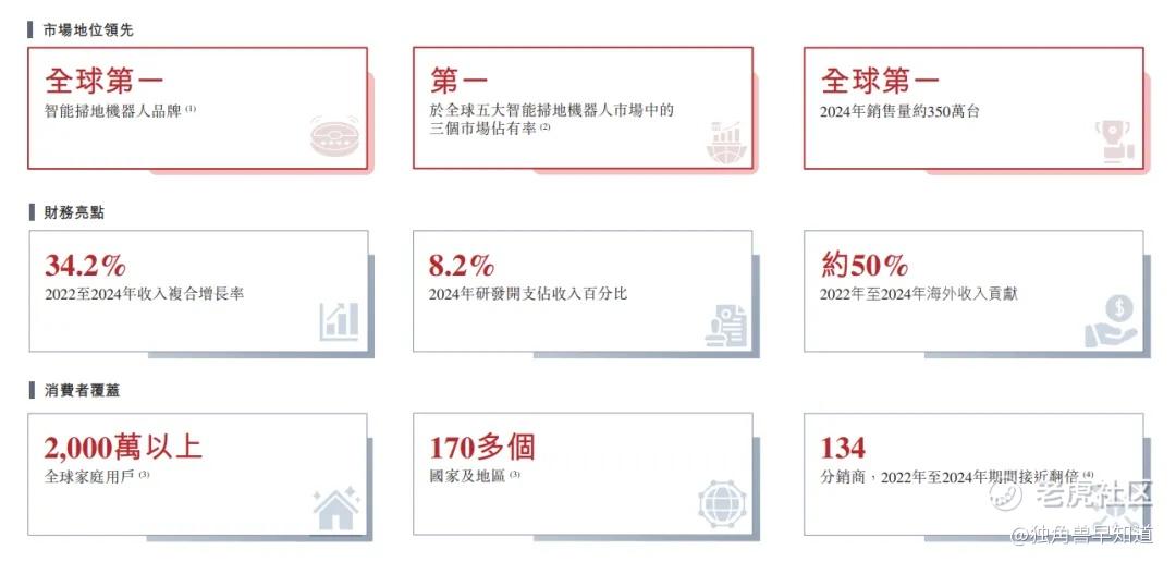 根据灼识咨询的数据,2024年,石头科技是全球GMV和销量第一的智能扫地机器人品牌;是韩国销量第一的智能扫地机器人品牌,按GMV计市占率为31.1%,按销量计则为25.6%;及德国销量第一的智能扫地机器人品牌,按GMV计市占率为34.4%,按销量计则为27.5%。