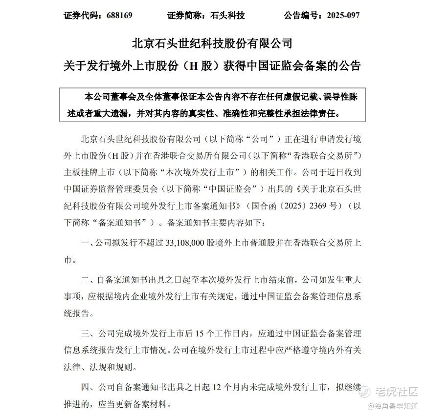 石头科技将计划发行不超过33,108,000股境外上市普通股并在香港交易所上市。