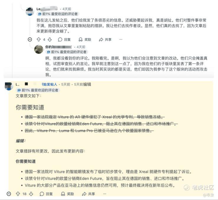 同时,在相关讨论区也有人表示自己在VITURE官方频道讨论该事件后被删帖,并且,该贴下面的网友回复耐人寻味。而该网友讨论的对象正是XREAL最新回应中,可能涉及禁售范围的VITURE Luma系列,该系列是目前VITURE的重点在售项目。