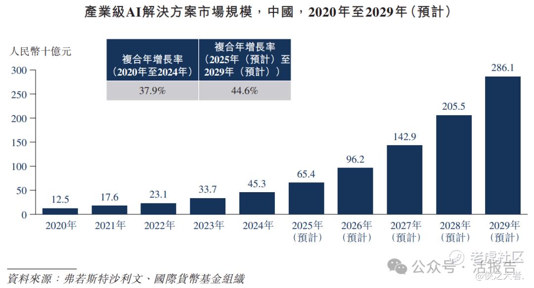 根据弗若斯特沙利文(Frost & Sullivan)的报告,2020-2029年,中国产业级AI解决方案市场呈现爆发式增长态势。市场整体规模从2020年的人民币125亿元扩张至2024年的人民币453亿元,期间复合年增长率为37.9%。未来,预计市场仍将保持44.6%的复合年增长率,增长至2029年的人民币2861亿元,发展势头强劲。
