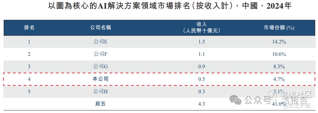 从细分市场来看,2024年以图为核心的AI解决方案领域市场规模约为人民币100亿元。就竞争格局而言,该市场拥有约30名参与者,包括大型互联网公司及成长迅速的科技公司。2024年,公司按收入计位列前五大公司之一,市场份额分别为4.7%。