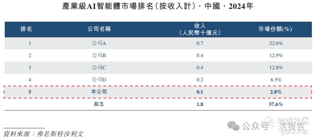 按2024年营业收入计,公司在中国产业级AI智能体提供商中位列第五,市场份额为2.8%;并在中国以图为核心的AI智能体提供商中位列第一,市场份额约50%。根据弗若斯特沙利文的数据,公司是行业内中国首家通过知识图谱有效减少大模型幻觉的企业。