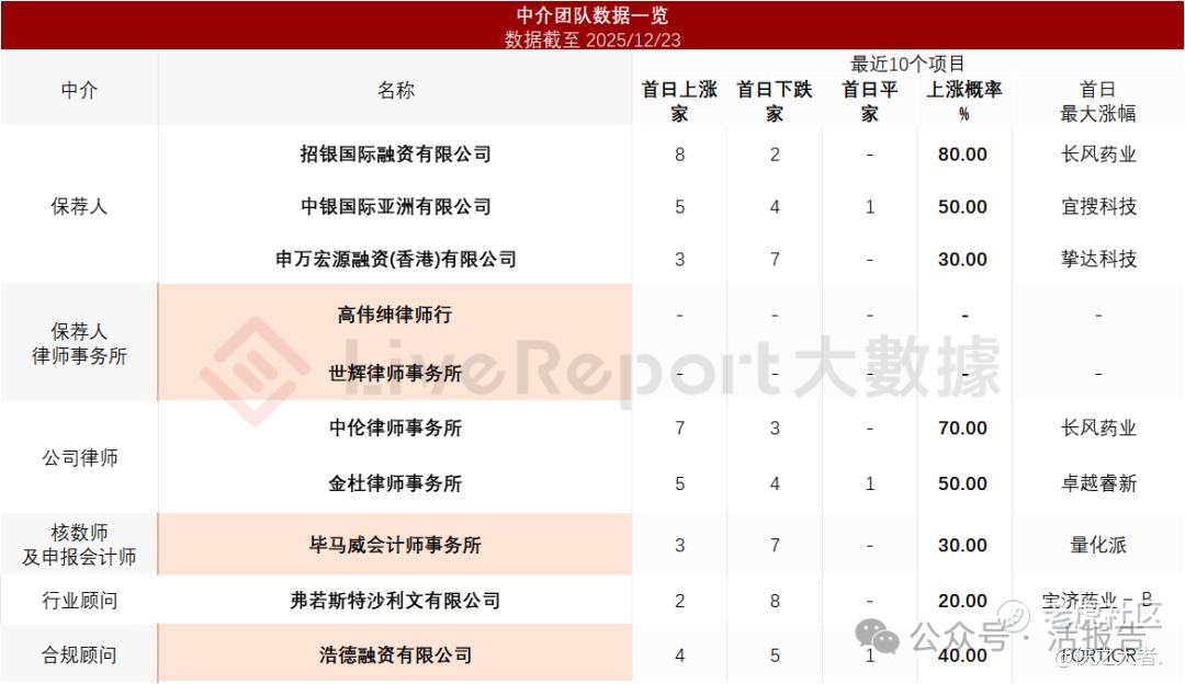 据**大数据统计,海致科技中介团队共计10家,其中保荐人3家,近10家保荐项目数据表现有待加强;公司律师共计2家,综合项目数据表现普通。整体而言中介团队历史数据表现差强人意。