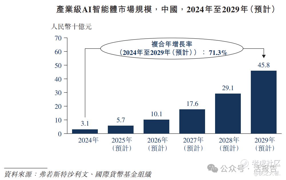 中国产业级AI智能体市场规模将在2024年到2029年间实现爆发式增长,从2024年的约人民币31亿元跃升至2029年的人民币458亿元,期间复合年增长率高达71.3%。